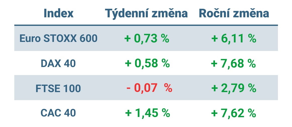 Akcie v Evropě rovněž převážně rostly, i když výrazně méně než ty americké. Některé povzbudivé ekonomické údaje pomohly překonat obavy z tempa zpřísňování měnové politiky ECB. Celoevropský index STOXX Europe 600 skončil týden o 0,73 % výše. Hlavní akciové indexy v jednotlivých zemích se také převážně posunuly vpřed. Francouzský index CAC 40 stoupl o 1,45 % a německý index DAX přidal 0,58 %. Pouze britský index FTSE 100 zaznamenal mírnou ztrátu.
