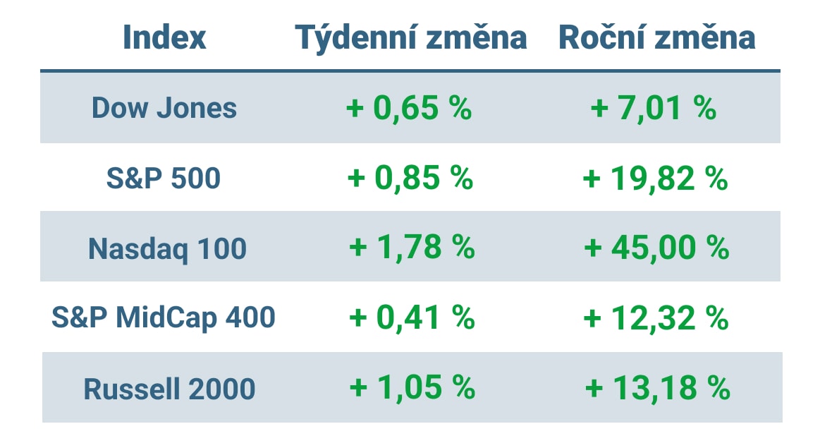 Tabulka ukazuje vývoj nejvýznamnějších amerických indexů v tomto týdnu a v roce 2023