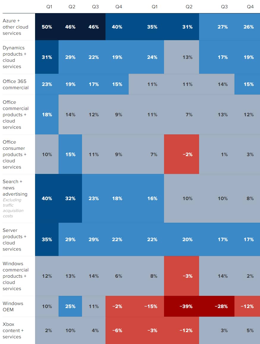 Růst produktů a služeb společnosti Microsoft za poslední 2 roky – meziroční změny