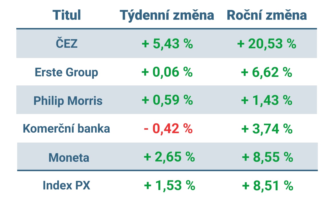 Index PX po celý minulý týden posiloval a zakončil týdenní obchodování na hodnotě 1354,41 bodu. Největší zásluhu na tom měly akcie energetického giganta ČEZ. Ty uzavřely týdenní obchodování s více než 5% ziskem na ceně více než 958 korun za akcii.