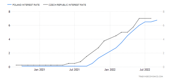 Zvednutí sazeb na Euru jen potvrdilo tendenci utahování měnové politiky. Málo kdo očekává, že by se tento trend neudržel do konce roku 2022. Avšak tento týden můžeme již pozorovat jisté slábnutí ve zvedání sazeb. Dobrým příkladem je náš severní soused Polsko. Polská centrální banka zvedla své sazby o 25 bazických bodů na 6,75 %. Poláci si uvědomují, že tak vysoké sazby se již začínají značně negativně projevovat v ekonomice. Už skončila doba, kdy na zlotém rostly sazby pravidelně o 75 bazických bodů. Zároveň však Polsko ukazuje, že nerezignovalo na boj s inflací. Zvednutí sazeb o 25 bazických bodů není absolutně nic dramatického. Škoda, že stejný postoj nezaujala i naše ČNB. Lehkým zvedáním sazeb, by zabraňovala spekulacím proti české koruně. Uvidíme, zda nedojde ke změně postoje ČNB na dalším zasedání na konci září.