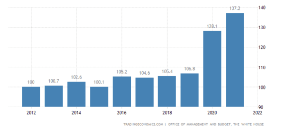 Vývoj zadlužení USA vzhledem k HDP