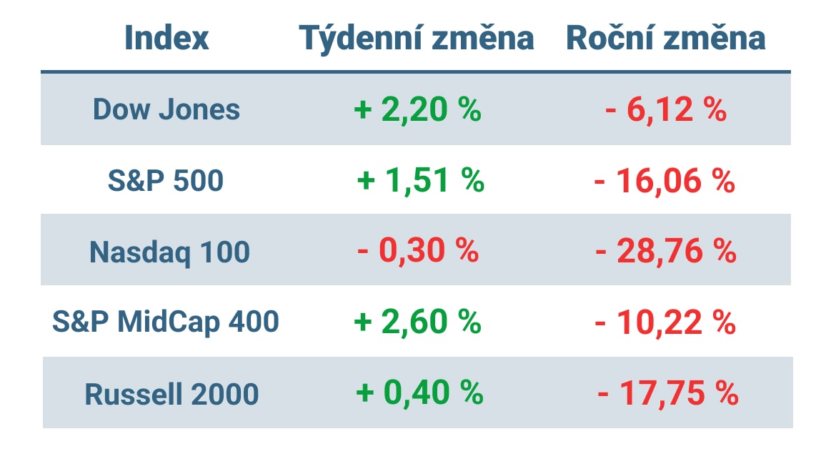 Tabulka ukazuje vývoj nejvýznamnějších amerických indexů v minulém týdnu a od začátku roku