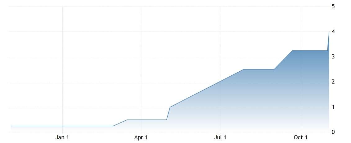 Většina tvůrců politiky Evropské centrální banky (ECB) hlasovala v říjnu pro zvýšení úrokových sazeb o tři čtvrtiny bodu v důsledku rostoucích obav z toho, že by se inflace mohla upevnit a že by se mohla objevit mzdová cenová spirála, jak ukázal zápis z jednání ECB. Někteří tvůrci měnové politiky Evropské centrální banky byli také citováni, že zpřísňování měnové politiky bude pravděpodobně muset pokračovat i poté, co se měnověpolitické nastavení normalizuje a posune do neutrálního pásma.