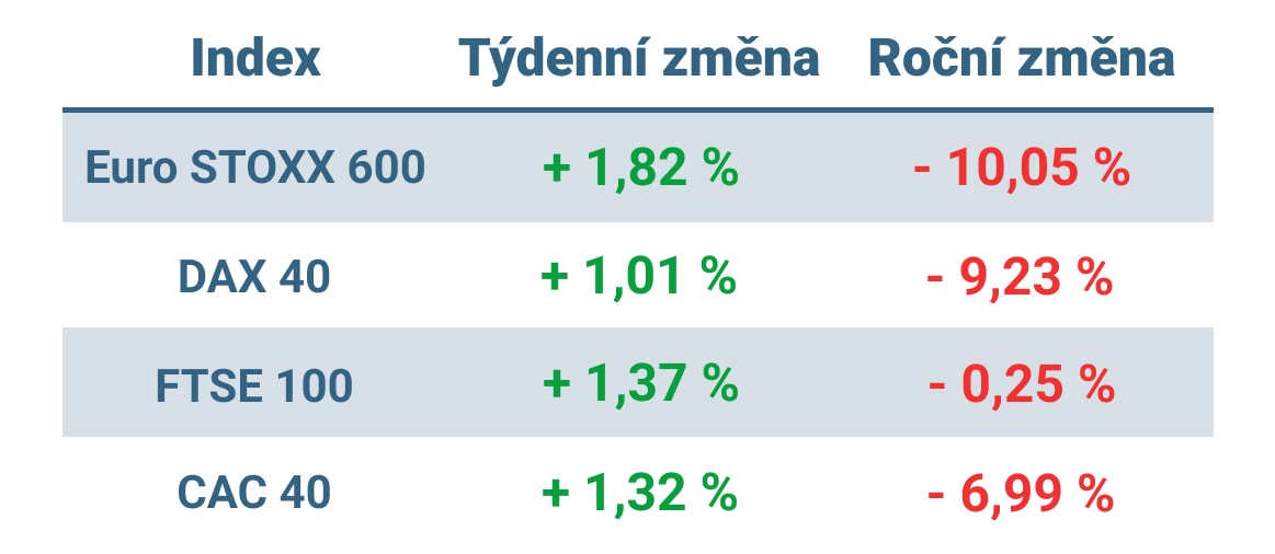 Evropské akcie rostly již šestý týden v řadě díky naději, že by centrální banky mohly zpomalit tempo zvyšování úrokových sazeb. V místní měně skončil celoevropský index STOXX Europe 600 týden o 1,82 % výše, zatímco německý index DAX si polepšil o 1,01 % a francouzský CAC 40 přidal 1,32 %. Britský index FTSE 100 pak vzrostl o 1,37 %.