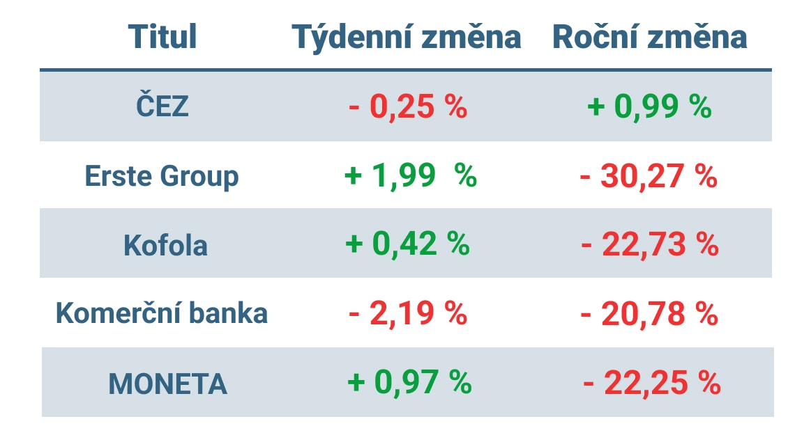 Vývoj ceny nejvýznamnějších titulů obchodovaných na pražské burze v minulém týdnu a od začátku roku