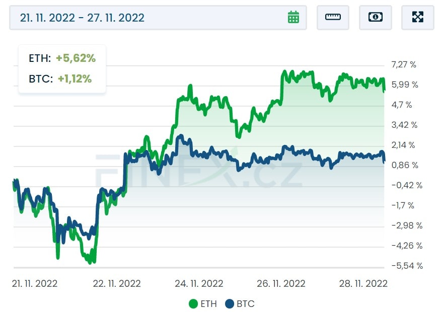 Dvě největší kryptoměny Bitcoin a Ethereum v minulém týdnu posílily o přibližně 1 respektive 5 %, přesto za poslední měsíc ztratily v důsledku krachu burzy FTX a následnému oslabení důvěry investorů v kryptoměnový trh přibližně pětinu své hodnoty. Bitcoin se tak aktuálně obchoduje pod cenou 17 000 dolarů, zatímco druhá největší kryptoměna Ethereum po delší době prorazila cenu 1 200 dolarů za minci.