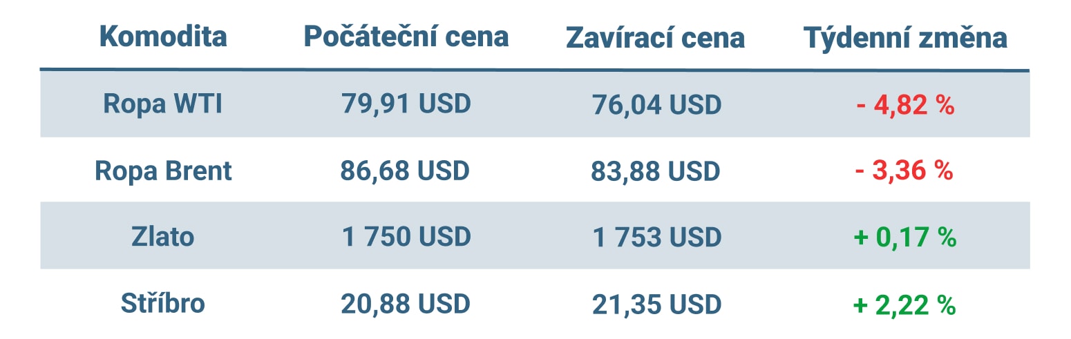 V New Yorku obchodovaná ropa West Texas Intermediate neboli WTI v pátek uskutečnila závěrečný obchod na úrovni 76,04 dolaru. Americký ropný benchmark, který se v pondělí dostal na letošní minimum pod 76 dolary, se za celý týden propadl o 4,82 % po ztrátách 10 % a 4 % v předchozích týdnech.