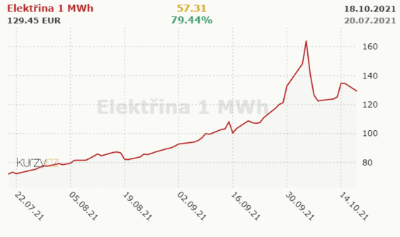 Cena elektřiny na pražské energetické burze. Zdroj: kurzy.cz