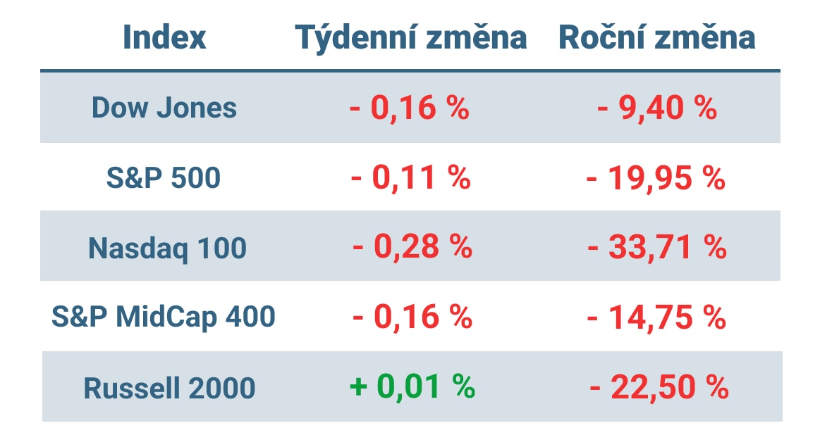 Tabulka ukazuje vývoj nejvýznamnějších amerických indexů v minulém týdnu a v roce 2022