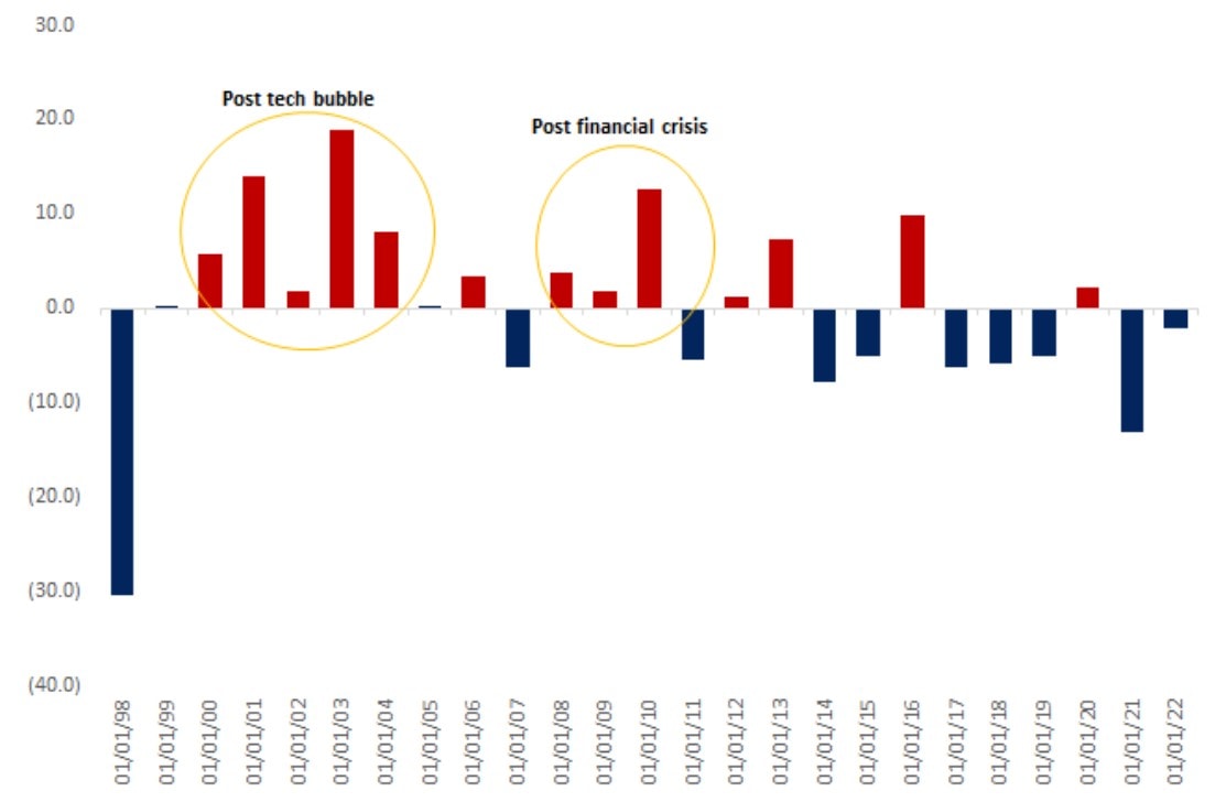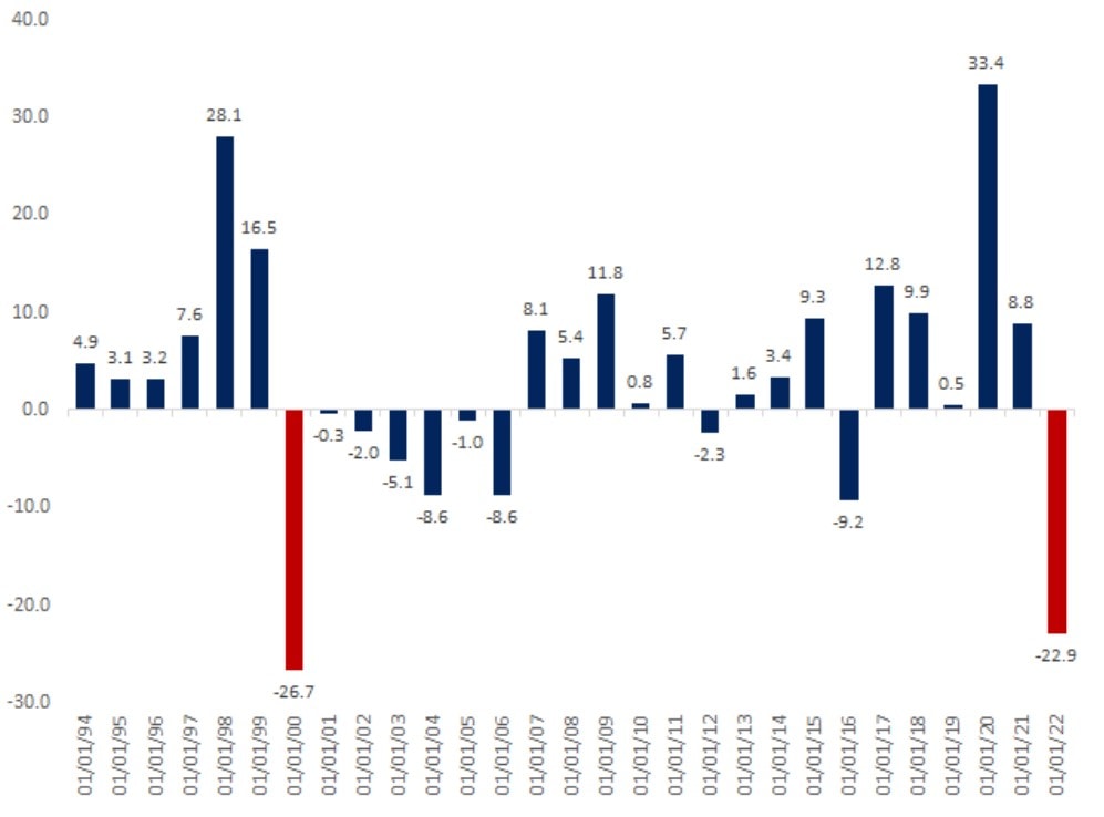 Hledáte-li něco pozitivního, pak je to možná fakt, že bychom v roce 2023 mohli očekávat zlepšení výkonnosti amerických akcií i dluhopisů. Podíváme-li se do historie, po letech, kdy vyvážená portfolia (poměr 60 % akcií a 40 % dluhopisů) klesala o více než 10 %, obvykle následovaly pozitivní roky.