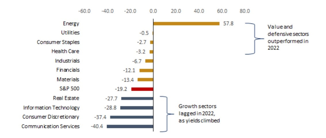 Přetrvávajícím trendem v roce 2022 byla relativně lepší výkonnost defenzivních sektorů na trhu. Kromě energetiky byly třemi nejvýkonnějšími sektory indexu S&P 500 v minulém roce sektory základního spotřebního zboží, zdravotní péče a veřejných služeb. Tyto sektory jsou tradičně považovány za odolné vůči recesi, jež mohou lépe obstát v obdobích zpomalení ekonomiky. Lze je také považovat za zajištění proti inflaci, protože většina spotřebitelů bude i při růstu cen nadále nakupovat základní spotřební zboží, zdravotní péči a veřejné služby.