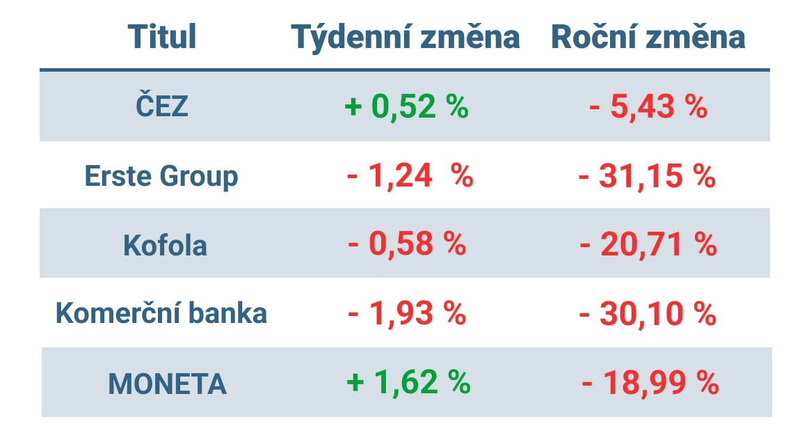 Vývoj ceny nejvýznamnějších titulů obchodovaných na pražské burze v minulém týdnu a od začátku roku