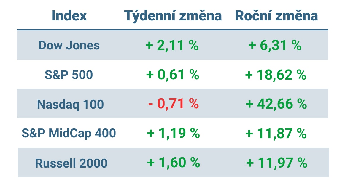 Tabulka ukazuje vývoj nejvýznamnějších amerických indexů v tomto týdnu a v roce 2023
