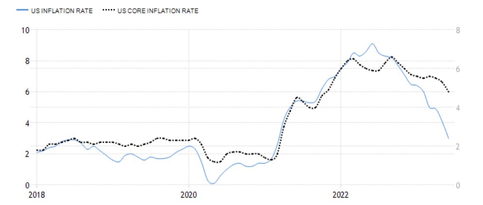 Inflace klesá, přičemž celkový ukazatel indexu spotřebitelských cen (CPI) v červnu zpomalil na 3,0 % z květnových 4,0 %. To vedlo mnoho pozorovatelů na Wall Street k závěru, že by inflace mohla být brzy zkrocena. To některé z analytiků přimělo k obnovení sázek na to, že ke snížení sazeb by mohlo dojít již do konce roku 2023.