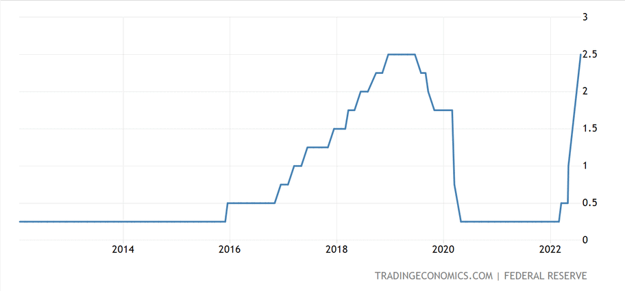 Pojďme si zrekapitulovat situaci. Americkou ekonomiku trápí vysoká inflace okolo 9,1 %. Fed bojuje s inflací zvedáním sazeb. Ty dosáhly po posledním zvýšení na konci června 2,25 %. To samo o sobě nestačí, aby byla inflace poražena. Úrokové sazby by měly být o něco výše než inflace. To však neznamená, že by zvedání sazeb nemělo žádný efekt, když inflace neklesá.