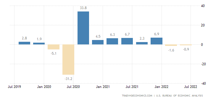 Spekulace o obrácení měnové politiky způsobil sám Fed. Ten otevřeně řekl, že se od nynějška bude daleko víc řídit daty z americké ekonomiky. Na čísla o inflaci, která mají největší váhu, si ještě počkáme. Ale dva klíčové údaje známe a jsou, světe, div se, rozporuplné. První je růst HDP, přesněji řečeno druhý čtvrtletní pokles amerického HDP za sebou. Technicky vzato USA jsou v recesi, i když Powell a americká administrativa tvrdí, že USA v recesi nejsou.