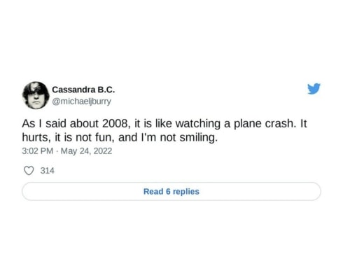 Přinejmenším jeden ne. Jedná se o investora Michaela Burryho, který je znám svými předpověďmi krachu. Na svém učtu publikoval tento tweet. Není v něm sice obsažen přesný důvod, proč je současná situace podobná s tou v roce 2008. Předpokládá se, že tento tweet kritizuje politiku Fedu, která se příliš soustředí na problém inflace a nezabývá se problémem recese, která v USA také hrozí. Pokud totiž bude v USA recese, Fed nebude mít jinou možnost než zvolnit měnovou politiku. To by však znovu roztočilo kola inflace.