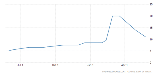 Ruská centrální banka využila sílu rublu a překvapivě snížila své sazby o 300 bazických bodů na 11 %. Ruské sazby jsou jen kousek od toho, aby se dostaly na úroveň před invazí, kdy byly na úrovni 9,5 %. Ruská centrální bankéřka Elvira Nabiullinová může být spokojená, protože se jí povedlo dosáhnout základního cíle centrální banky, kromě peněžní stability, a to důvěra ve vlastní měnu. Během zahájení invaze na Ukrajinu, ruská centrální banka zvedla svoje sazby na 20 % a tím vyslala jasný signál především bohatým občanům. Neopouštějte rubl ve prospěch zahraničních deviz, protože jeho držení vám přinese silné zisky. A to nejenom na úrocích, ale na kurzu rublu k hlavním měnám jako dolar nebo euro. Ale i přes ruský úspěch, spočívající v tom, že se ruská měna pod vlivem sankcí nezhroutila, Rusko sužuje inflace. Ta podle oficiálních statistik v dubnu dosáhla 17,5 %.