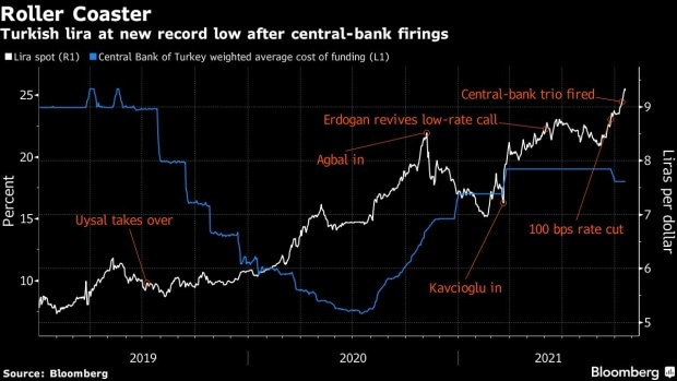 Vývoj turecké liry a výšky úrokových sazeb zdroj: bloomberg.com