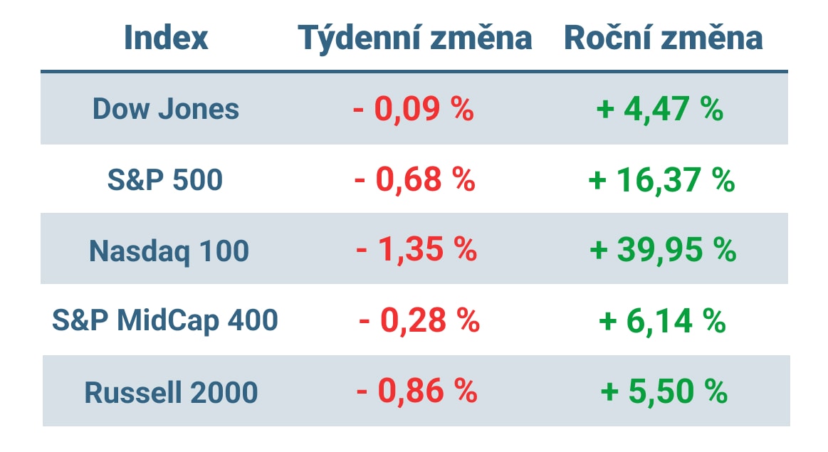 Tabulka ukazuje vývoj nejvýznamnějších amerických indexů v tomto týdnu a v roce 2023