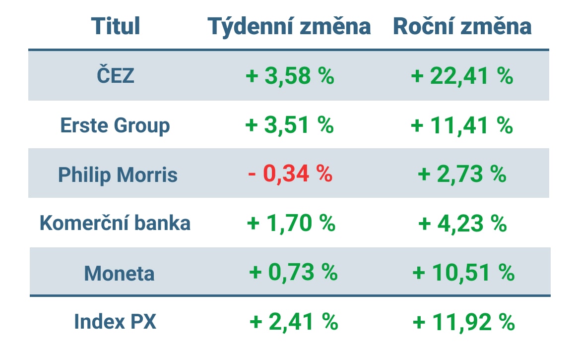 Pražská burza napsala oproti předcházejícímu týdnu, kdy ztratila 1,60 %, zcela jiný příběh a naopak v tomto týdnu o téměř 2,5 % posílila. Dařilo se víceméně všem titulům, přičemž nejvýrazněji – o více než 3,5 % – vzrostly akcie energetického giganta ČEZ a finanční skupiny Erste Group.