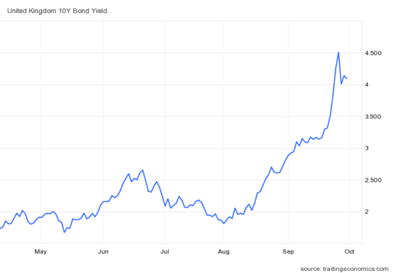 Britská libra samozřejmě zareagovala propadem. Vzhledem k dolaru se zastavila těsně nad paritou. Libra se taktéž propadla ke kurzu koruny a stala se tak nejlevnější v celé české moderní historii. To však nebyl jediný efekt. Společně s padající librou začaly stoupat výnosy na britských dluhopisech. Jak vidíme na grafu, nejvyšší hodnota výnosů dosáhla 4,5 %. To by bylo pro Velkou Británií smrtící. Tak velký úrok na dluhopisech by znamenal obrovské problémy a v podstatě neodvratitelný statní bankrot, protože by Velká Británie směřovala do dluhové pasti. Proto Anglická centrální banka začala jednat a znovu se rozhodla nakupovat střednědobé britské dluhopisy, aby zabránila jejich růstu. V grafu vidíme, že tento krok přinesl snížení výnosů na 4,09 %. V následujících dnech bude zajímavé sledovat, kam až se podaří anglické centrální bance výnosy stlačit.