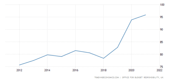 Vývoj zadlužení Velké Británie k HDP za posledních deset let