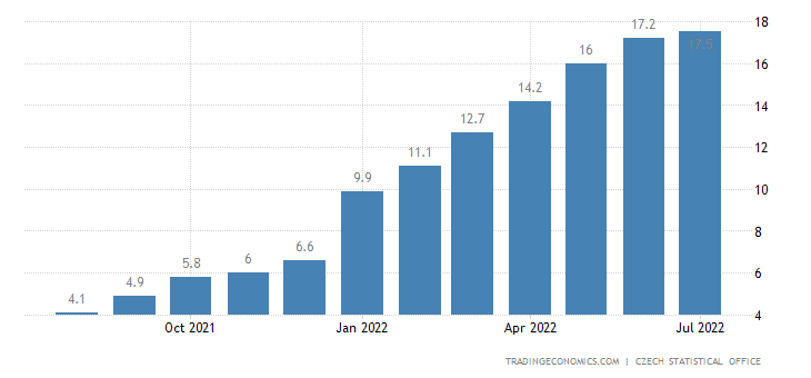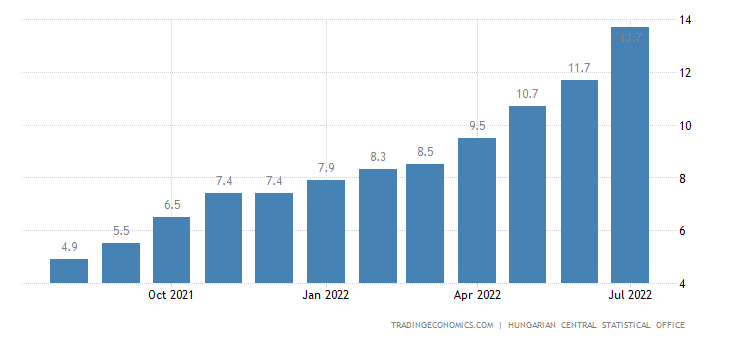 Jestli existuje jedna země, která se opravdu snaží porazit inflací zvedáním úrokových sazeb, je to Maďarsko. Maďarská centrální banka zvedla svoje sazby o 100 bazických bodů na současných 11,75 %. Červencová inflace byla v Maďarsku 13,7 %. Jestli letní prázdniny byly špičkou inflace, tak se Maďarsko pomalu dostává do stavu, kdy úrokové sazby budu stejně velké jako inflace. Díky tomu by reálná úroková sazba mohla být poprvé nenulová.