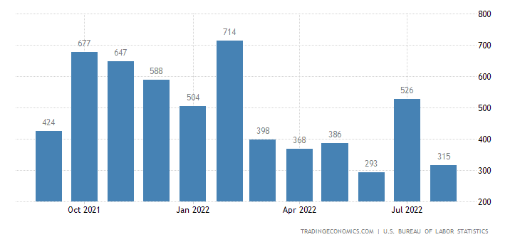 Vraťme se k pracovním statistikám z amerického trhu práce. Počet nových pracovních míst byl lehce nad odhadem a dosáhl 315 tisíc oproti očekávaným 298 tisíc. Pracovní trh tak nepřipravil nemilé překvapení jako minulý měsíc, kdy tvorba pracovních míst dosáhla 526 tisíc. Tento statistický údaj byl v souladu s očekáváním.
