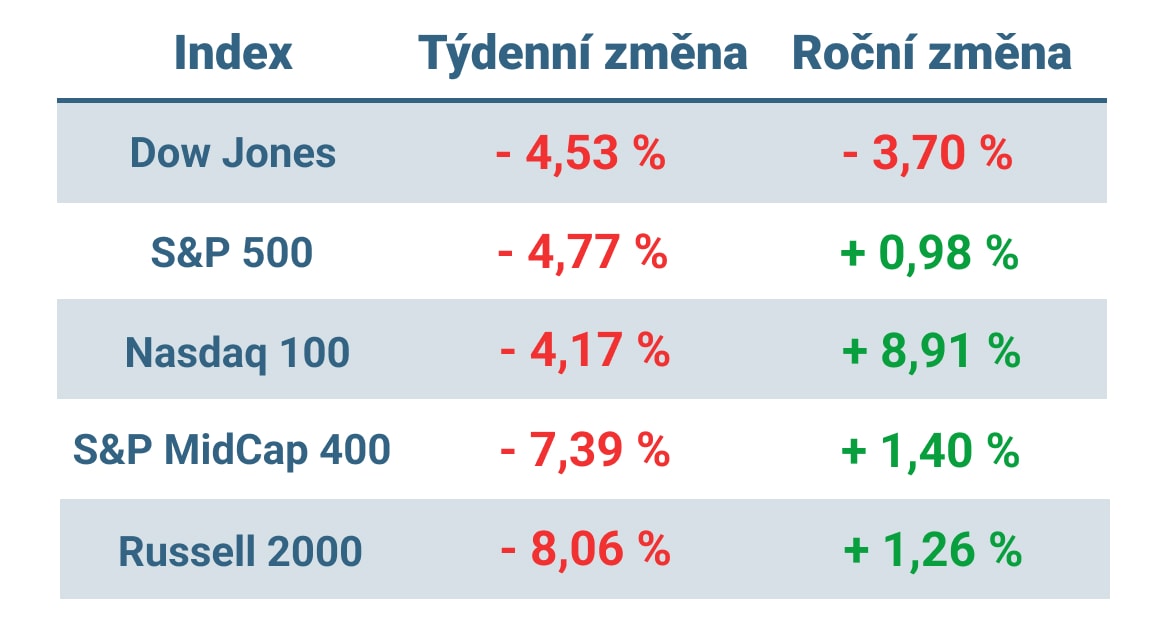 Americké akcie v průběhu týdne prudce oslabily, protože investoři vstřebávali další tvrdé komentáře předsedy Federálního rezervního systému Jeroma Powella. Americká centrální banka má stále co dělat s ochlazováním inflace a horkého trhu práce. Index S&P 500 tak v pátek klesl na nejnižší intradenní úroveň od 5. ledna. Výprodej mohl být urychlen i tím, že se index dostal pod 100denní i 200denní klouzavý průměr – metriky sledované technickými tradery. Akcie s malou tržní kapitalizací dosáhly horších výsledků než akcie s velkou tržní kapitalizací, což vedlo k výraznějším propadům indexů Russell 2000 a S&P MidCap 400. Krom toho také hodnotové akcie klesly více než jejich růstové protějšky.