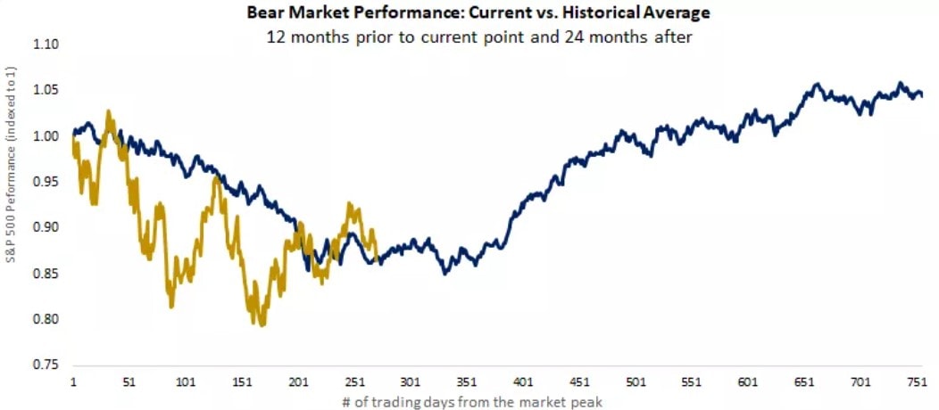 Akciový trh je v současné době zhruba 19 % pod svým rekordním maximem z 3. ledna 2022. Předchozí medvědí trhy byly v této fázi na velmi podobné úrovni. S výjimkou poklesu v letech 2008 – 2009, který pramenil z globální finanční krize, je průměrný pokles do tohoto okamžiku téměř totožný se současným poklesem.