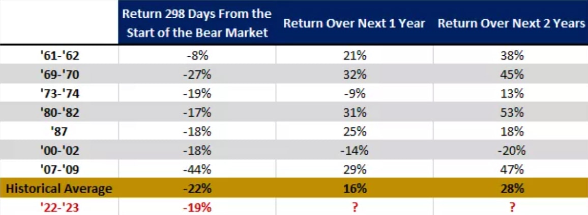 Tato tabulka ukazuje průměrnou výkonnost předchozích medvědích trhů 298 od začátku, v průběhu následujícího roku a v průběhu následujících dvou let