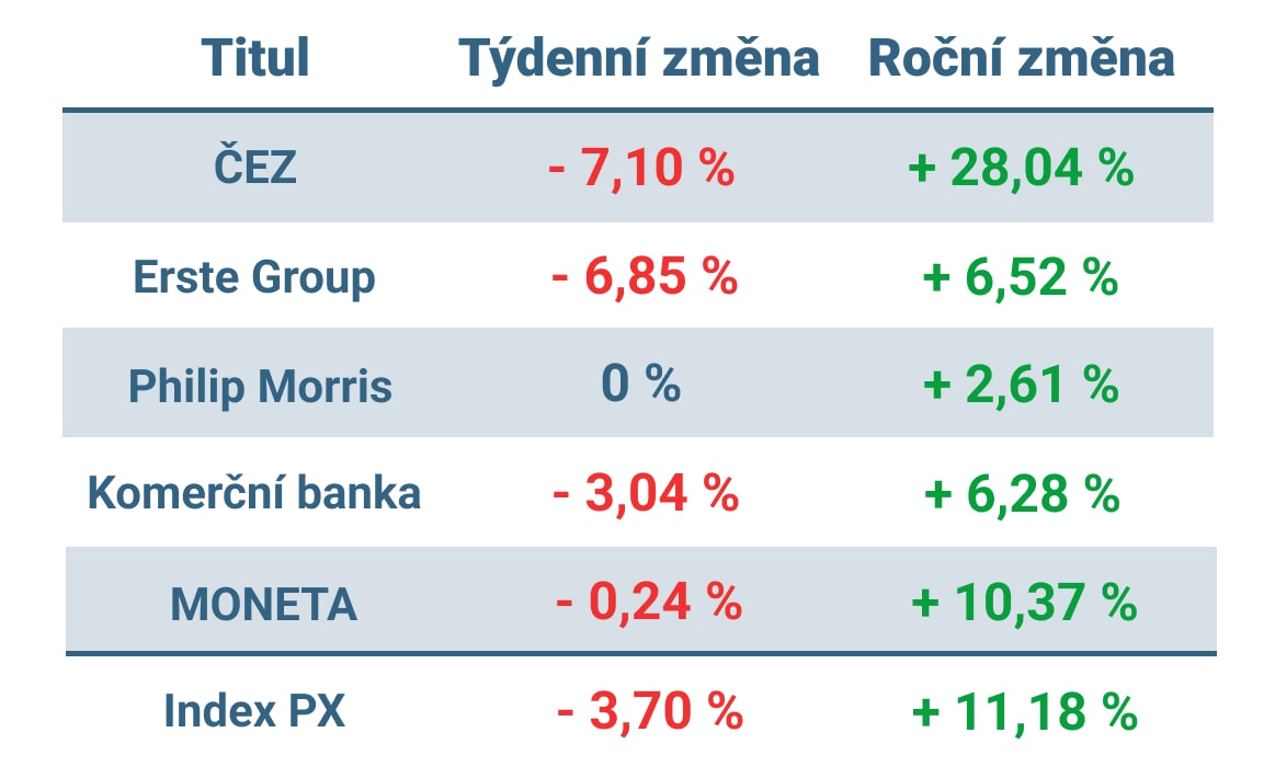 Na českém akciovém trhu jsme sledovali teprve druhý, ovšem velmi výrazný, týdenní propad v tomto roce a to o 3,70 %. České tituly se propadaly zejména ve čtvrtek a v pátek, přičemž nejvýrazněji se na poklesu indexu PX podílely největší akcie Pražské burzy. Akcie ČEZ a Erste Group, naopak vítězové předcházejícího týdne, se propadly o 7,10 respektive 6,85 %.