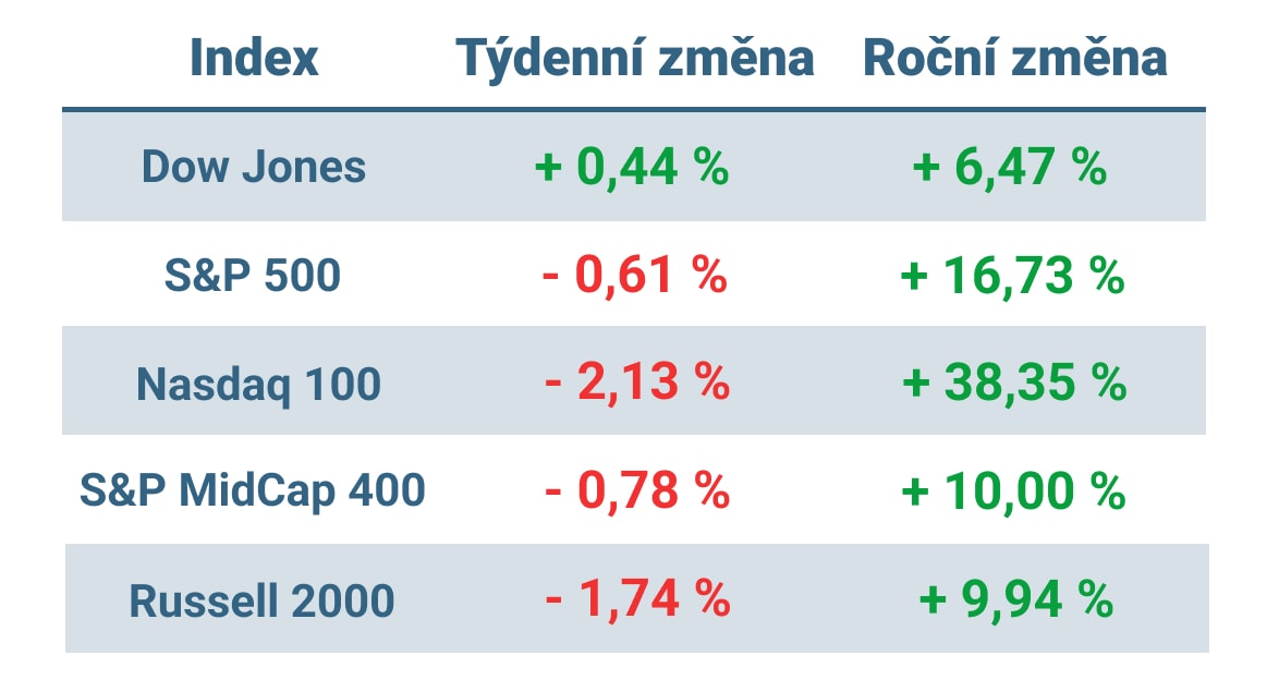 Tabulka ukazuje vývoj nejvýznamnějších amerických indexů v minulém týdnu a v roce 2023