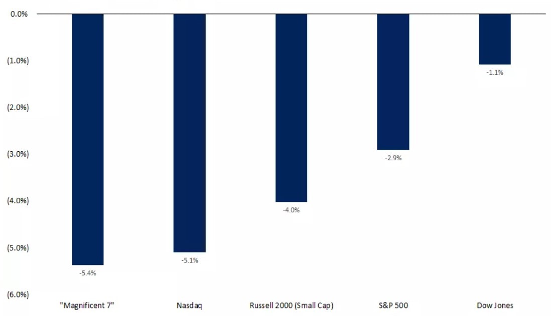 Tento graf ukazuje, že od začátku srpna nejvíce korigovaly akcie technologických společností s velkou kapitalizací. “Magnificent 7” představují společností Apple, Microsoft, Amazon, Nvidia, Alphabet, Meta a Tesla