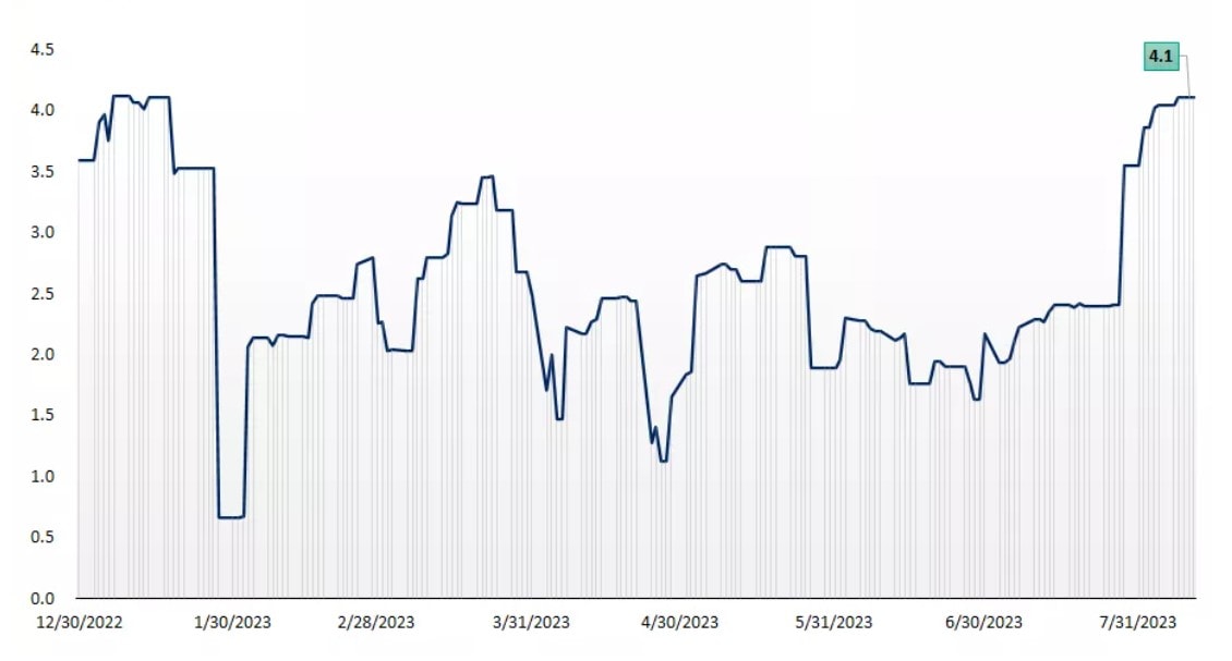 Jako číslo týdne volíme 4,1. Zda se velmi pravděpodobné, že se americká ekonomika vyhne v letošním roce recesi, neboť prognostický nástroj Fedu GDP-Now tool předpokládá růst HDP USA ve třetím čtvrtletí v meziročním srovnání o pozoruhodných 4,1 %.