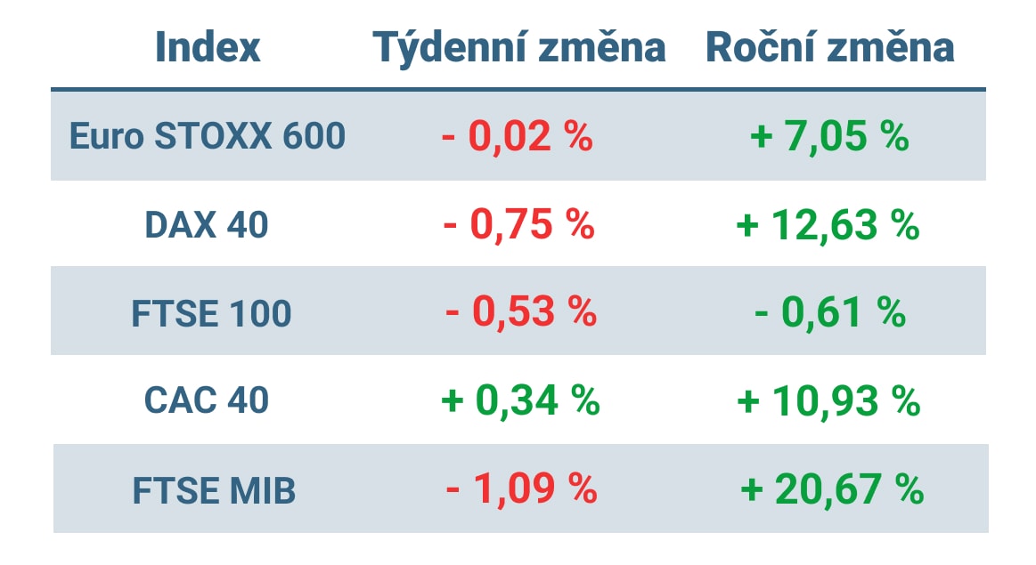 Hodnota celoevropského indexu STOXX Europe 600 se během týdne téměř nezměnila. Rozhodnutí italské vlády usilovat o zavedení mimořádné daně ze zisků bank a rostoucí obavy z možného hospodářského zpomalení v Číně však negativně ovlivnily sentiment.