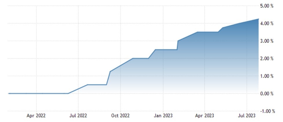 Evropská centrální banka (ECB) ve svém posledním Ekonomickém bulletinu uvedla, že od červnového zvýšení úrokových sazeb následný vývoj podpořil očekávání, že by se inflace měla v roce 2023 zmírnit, ale stále zůstat delší dobu nad 2% cílem.
