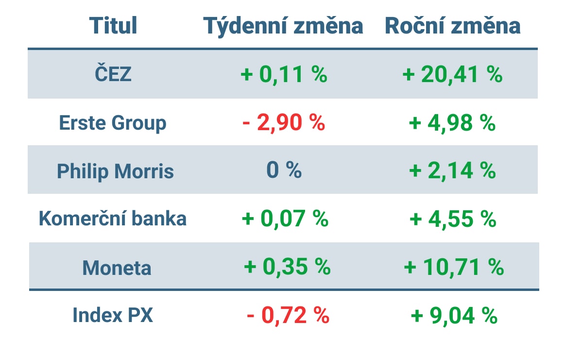 Český akciový trh reprezentovaný indexem PX se v minulém týdnu propadl o 0,72 %. Většina hlavních sledovaných titulů se přitom obchodovala téměř beze změny. Cena akcií ČEZ, Philip Morris, Komerční banky a Monety se nepohnula ani o půl procenta.