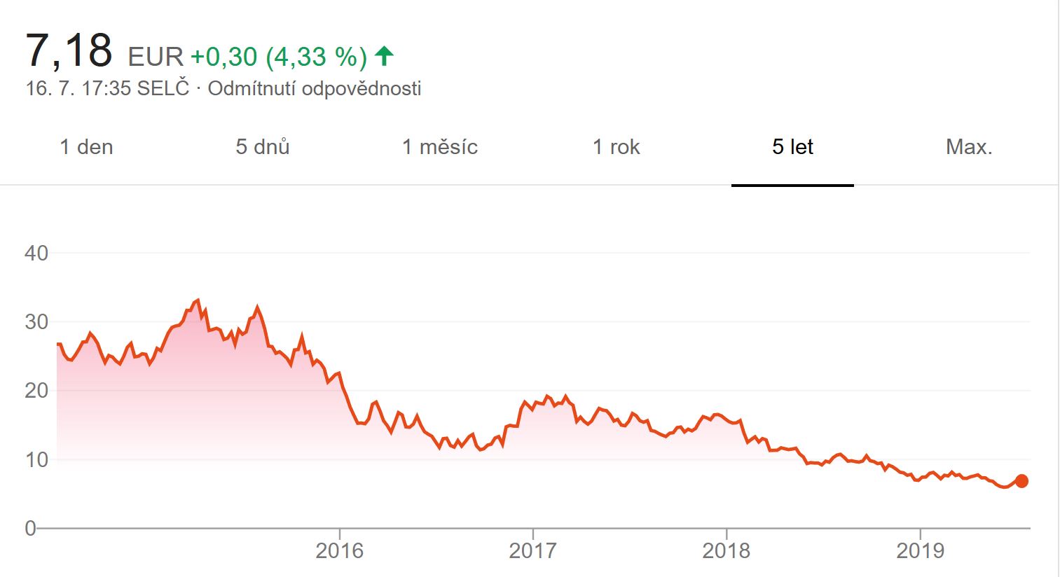 Od rychlého zotavení v roce 2010 na cenu 55 euro, akcie s krátkodobými výjimkami směřují pouze dolů, jako by bance pomalu docházel dech. Sám si pamatuji telefonní hovor z ledna 2017 od jedné nejmenované makléřské společnosti, kdy mi byla nabízena investice do akcií Deutsche Bank jako “tutovka”. Akcie za sebou tehdy měly kratší období růstu a jejich cena se pohybovala kolem 19 euro. Od té doby spadly na třetinu…