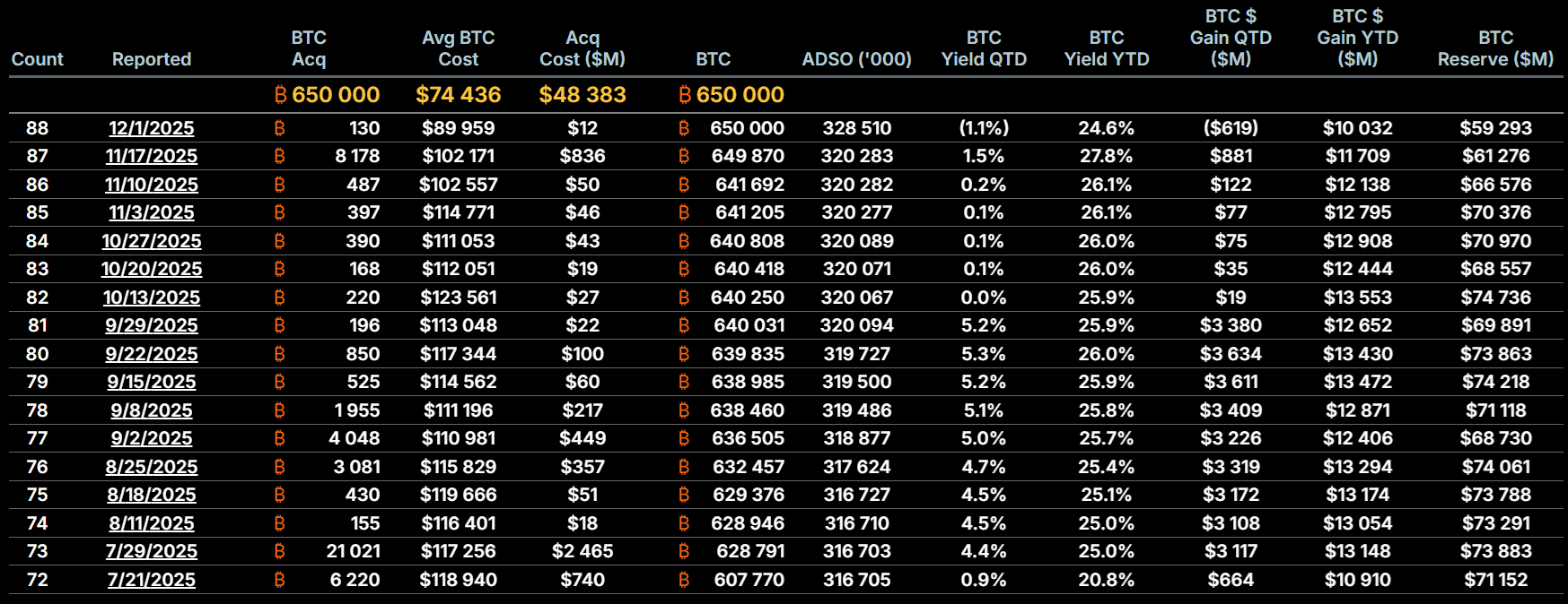 Strategie společnosti spočívá v získávání kapitálu, když se její akcie obchodují nad čistou hodnotou aktiv, přičemž vybrané prostředky využívá k nákupu dalších bitcoinů, čímž zvyšuje držený Bitcoin na akcii.