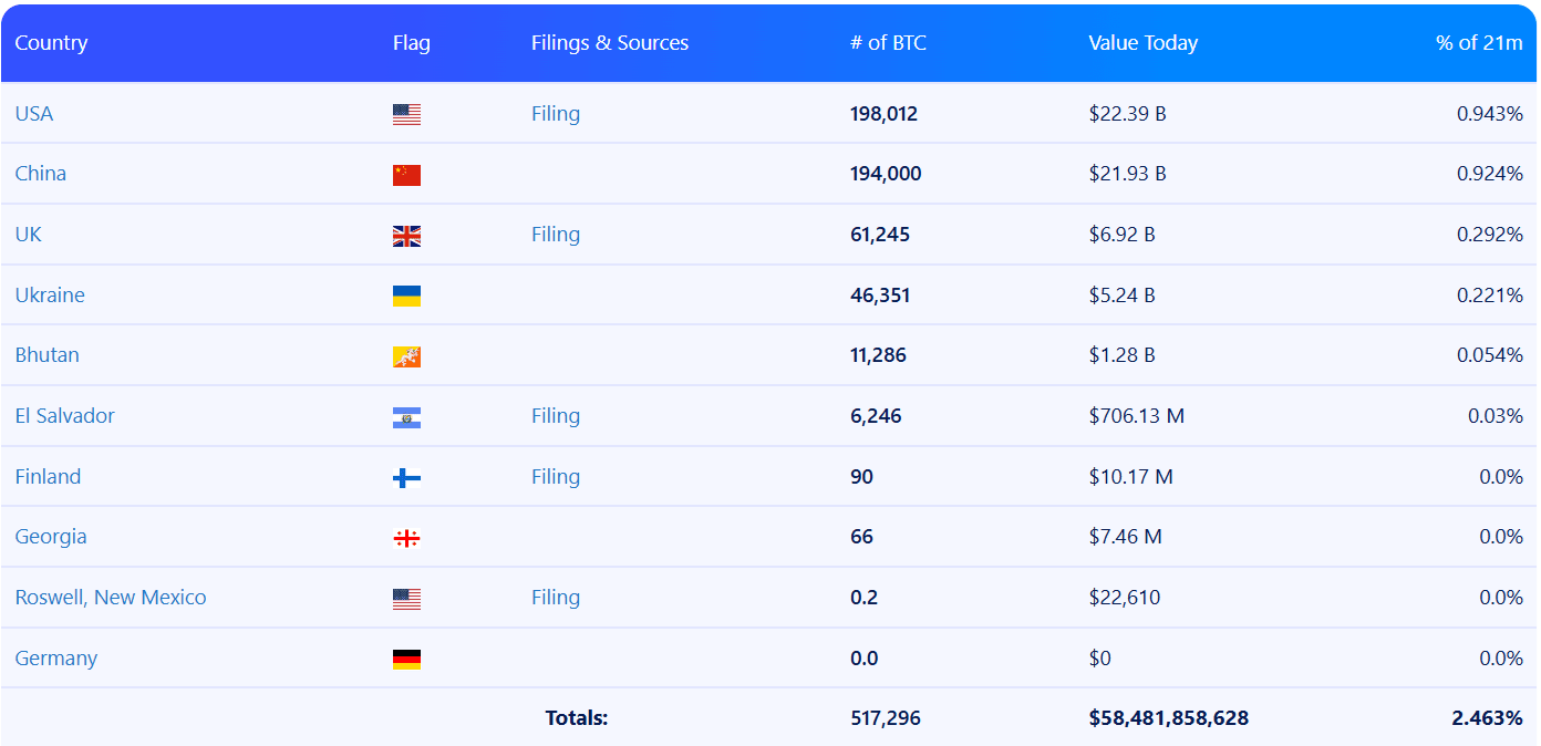 Země s nejvíce bitcoiny