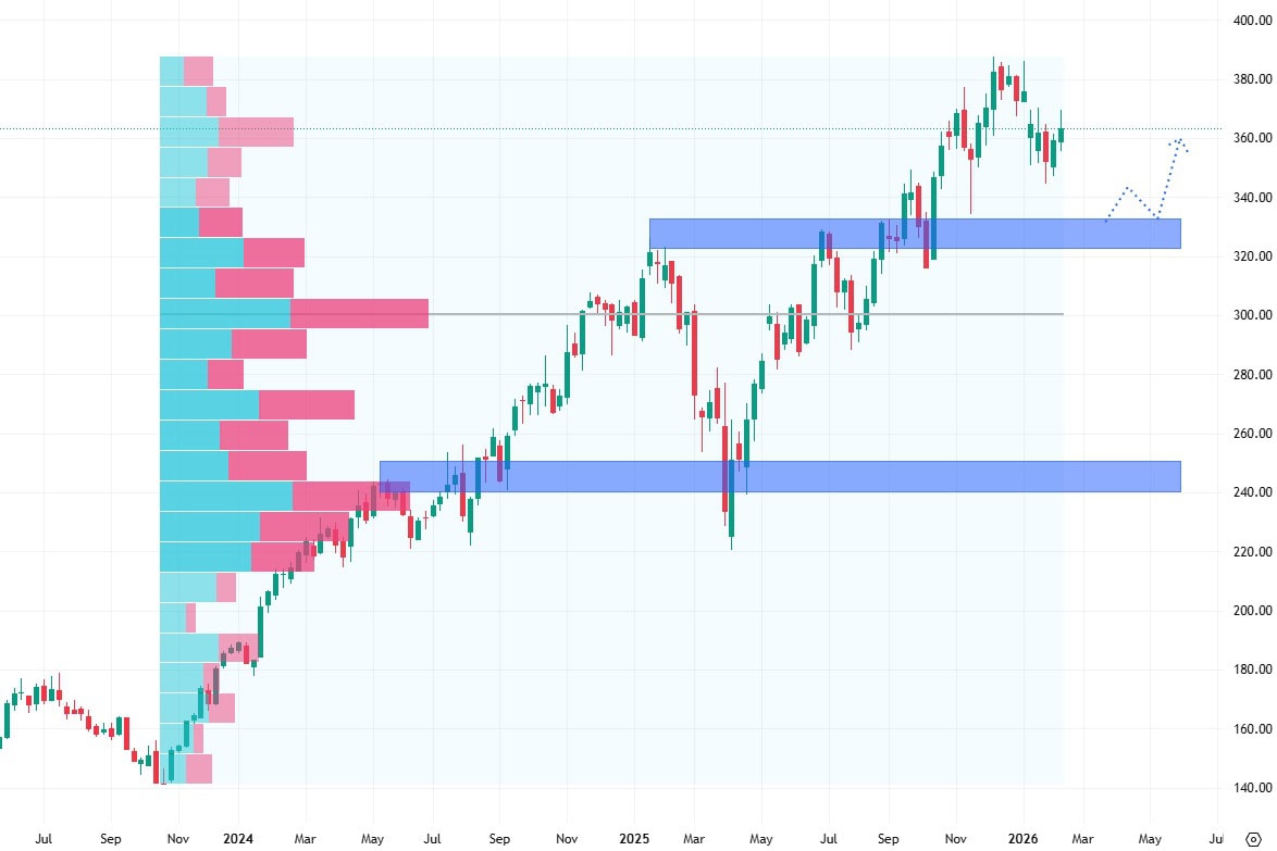 Akcie American Express se rovněž obchodují v menší prodejní korekci s tím, že nejbližší support mají na dohled. Ten se nachází na ceně 330 USD a jedná se o starší proražené cenové maximum.