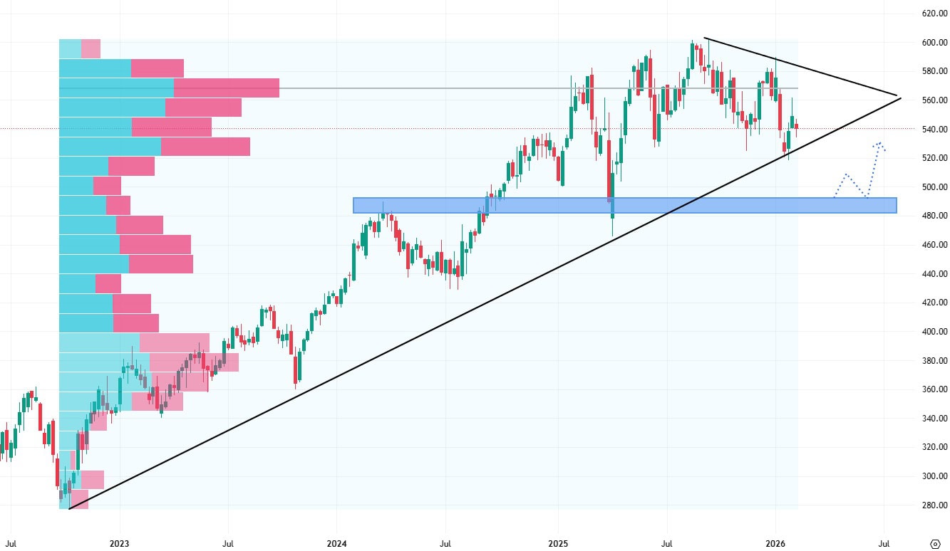 Cenový graf tvoří na svém vrcholu formaci triangl, kterou velmi často opouští volatilním cenovým pohybem. Nejbližší support se nachází na ceně 400 USD za akcii.