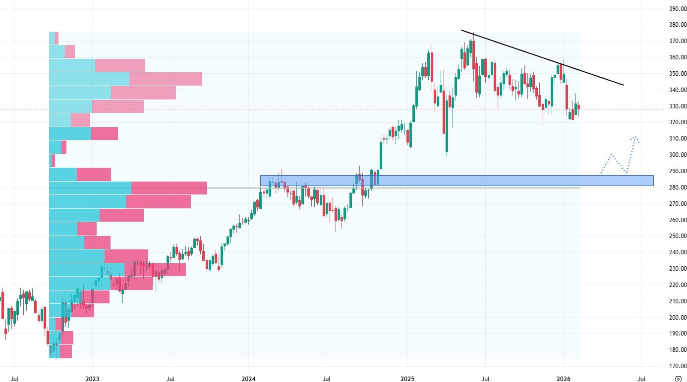 Akcie Visa se obchodují dlouhodobě v rostoucím trendu, nicméně poslední rok tyto akcie oslabují. V rámci cenové korekce respektují hodnotu klesající trendové čáry a nejbližší support se nachází až na ceně 290 USD.