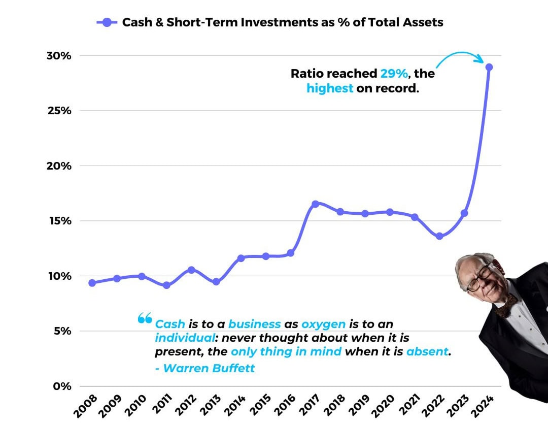 Nedávné zveřejnění dat společnosti Berkshire Hathaway ukázalo, že Buffett nyní drží rekordní podíl hotovosti a krátkodobých investic, který dosahuje až 29 % celkových aktiv.