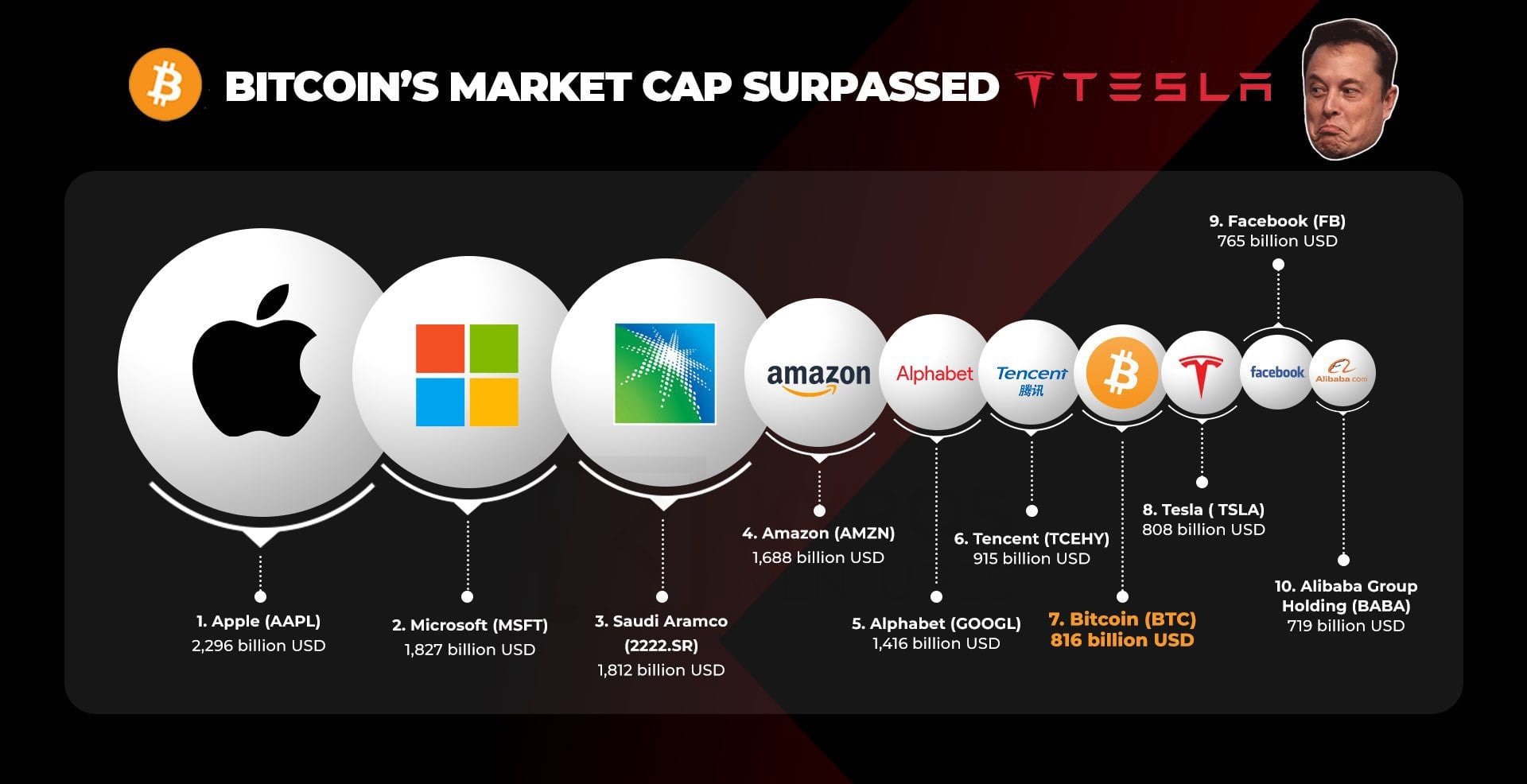 V návaznosti na to tržní hodnota BTC s 860,4 miliardami dolarů překonala tržní hodnotu samotné Tesly, která se pohybuje momentálně okolo 818,4 miliard dolarů.