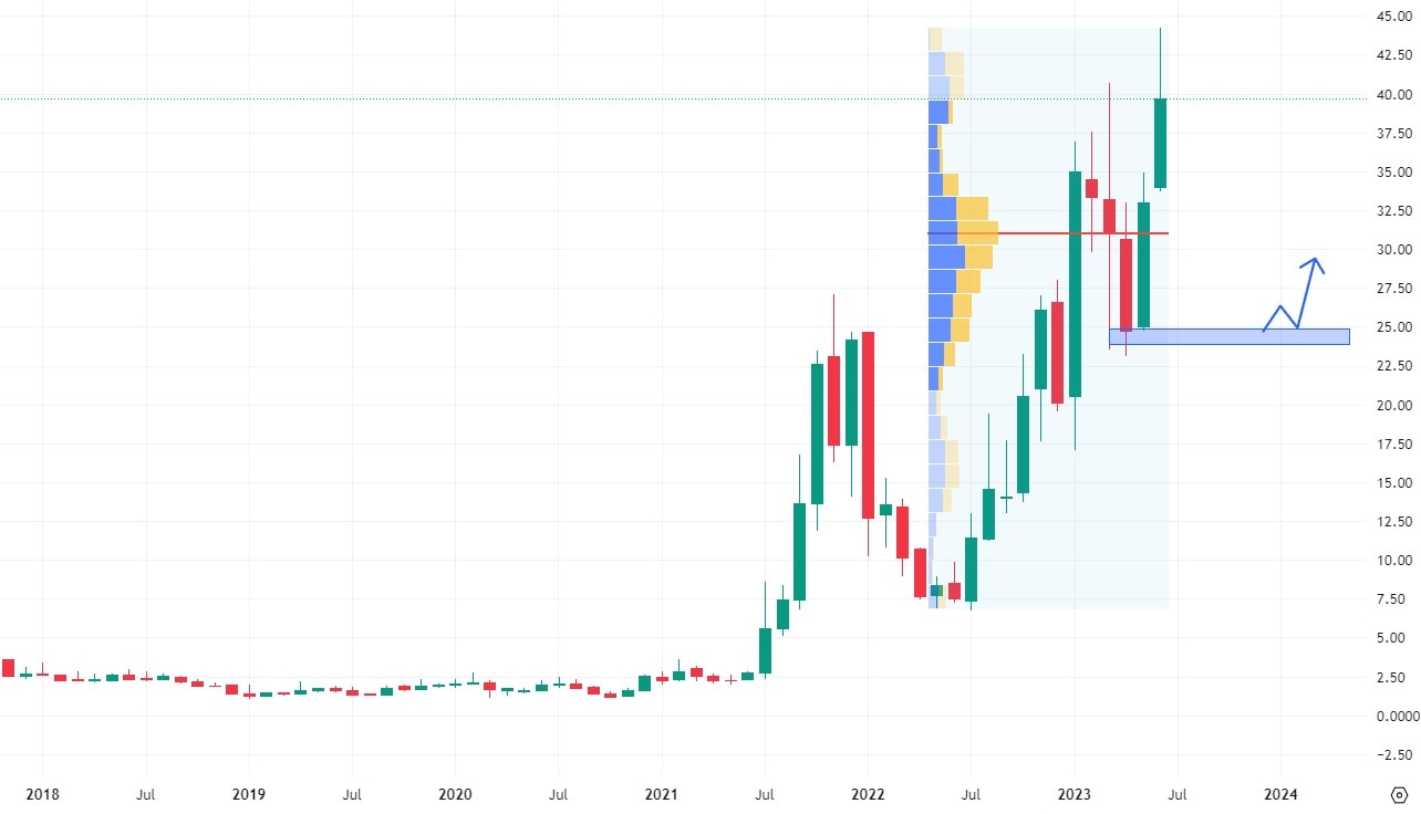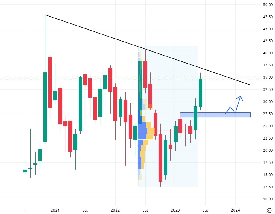 Akcie Li Auto se od svého IPO obchodují v klesajícím trendu a to v rámci velmi vysoké volatility. V současné době již probíhá test klesající trendové čáry. Pokud by došlo k breakoutu, bude tento trend negován a akcie se poprvé ve své historii dostanou do rostoucího trendu. Pokud se tak nestane, nejbližší support se nachází na ceně 27,5 USD, kam může být prodejní korekce trhem vedena.