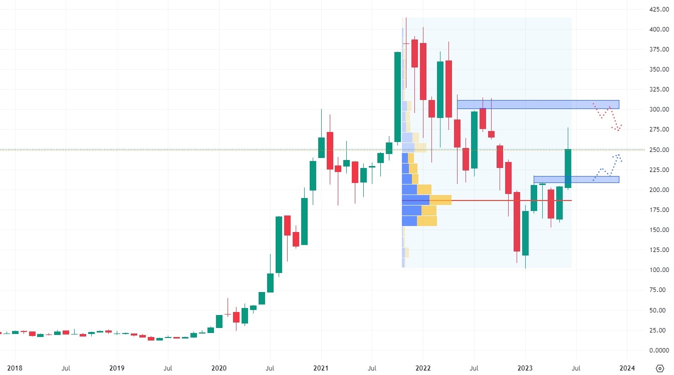 Akciový růst v letošním roce nejspíše ještě nekončí, protože struktura trhu vykazuje rezistentní zóny až na vyšších cenových hodnotách. Nejbližší rezistence se nachází na ceně 300 USD a je tvořena cenovými výběžky z poloviny loňského roku. Na druhou stranu support na ceně 200 USD dává investorům naději, že by se mohly akcie Tesla dlouhodoběji obchodovat v rostoucím trendu.